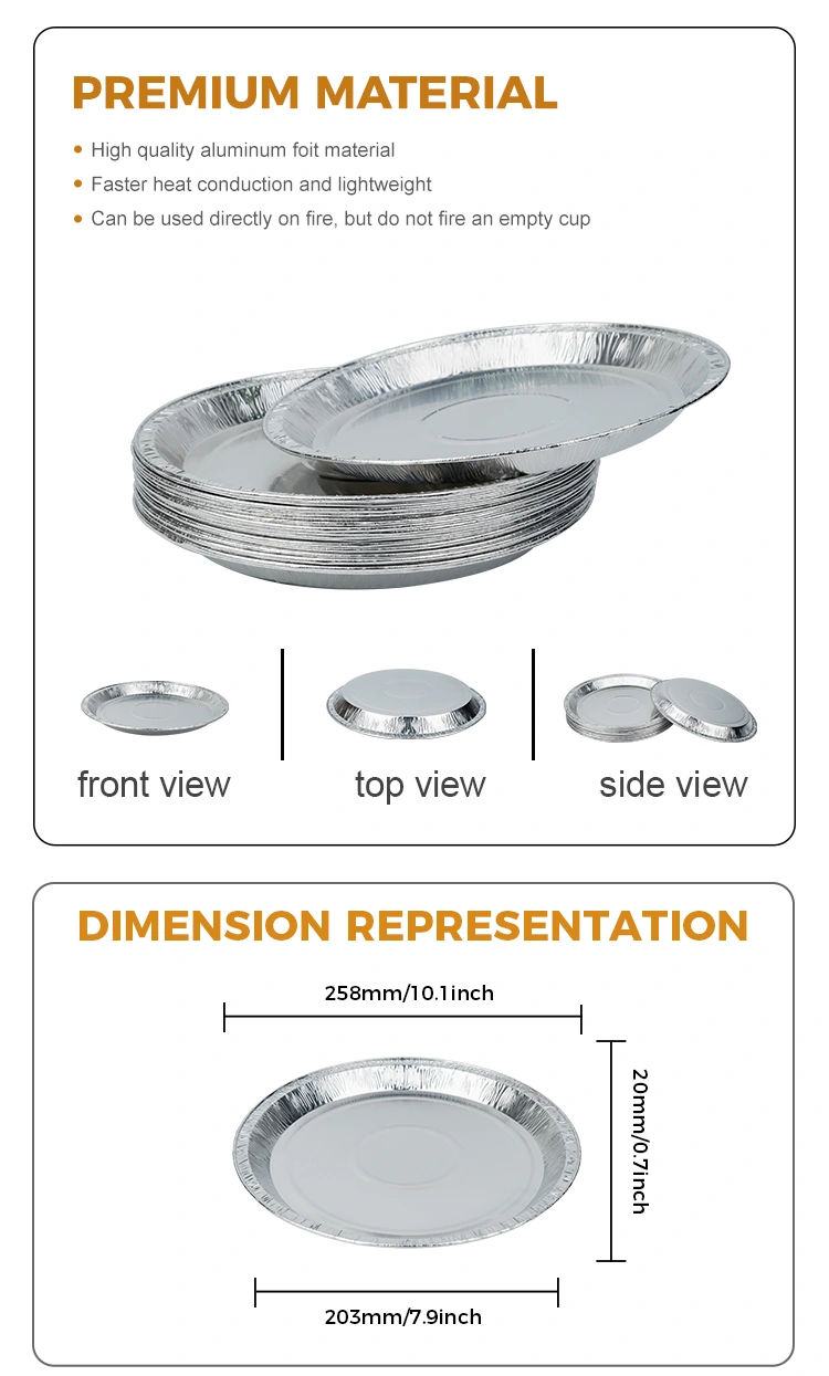 Il foglio di alluminio Yunchu offre un foglio di alluminio in argento da 10 pollici in alluminio con il modello 13110. Il prodotto ha un diametro superiore di 258 mm (circa 10,1 pollici), un diametro inferiore di 203 mm (circa 7,9 pollici) e un'altezza di 20 mm (circa 0,7 pollici). Con una capacità di circa 695 ml (circa 24,5 once), è adatto per cuocere la pizza senza attaccare, facile da rilasciare dallo stampo e non ha odore. Inoltre, il suo design del bordo rialzato impedisce agli ingredienti di versare e aumentare la praticità. Possiamo anche fornire servizi di personalizzazione del logo per aiutarti ad approfondire l'impressione dei tuoi clienti e migliorare la consapevolezza del tuo marchio.