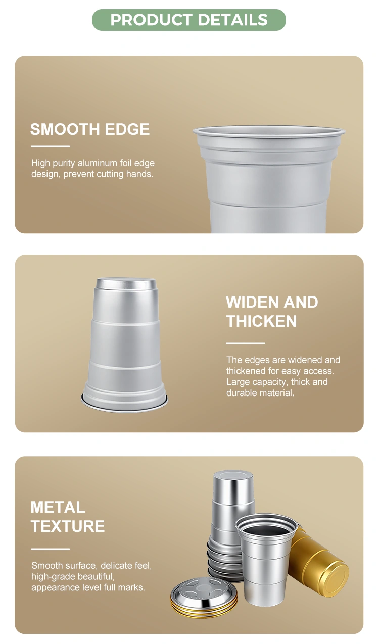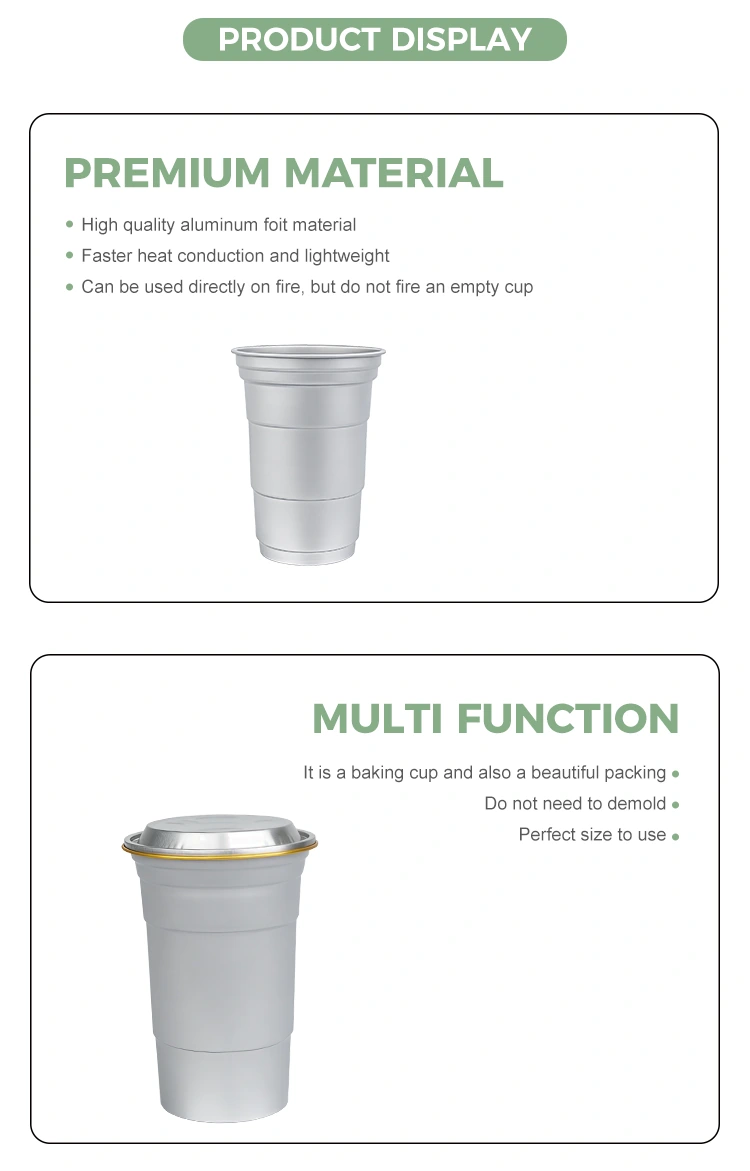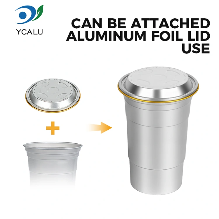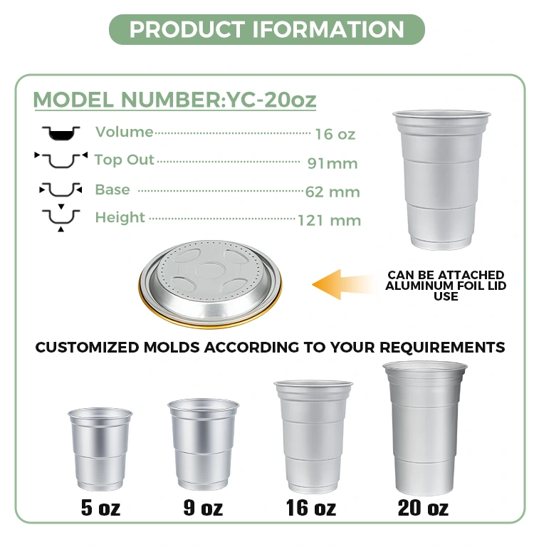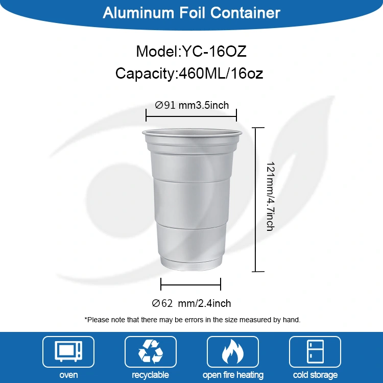 Yunchu è un produttore leader di bicchieri per bevande in foglio di alluminio personalizzato monouso da 16 once in Cina. Questa tazza per bere in foglio di alluminio personalizzata usa e getta da 16 once è una tazza in foglio di alluminio da 460 ml adatta per bevande standard come caffè e birra. Presenta un design standardizzato ed è rivolto principalmente a utenti commerciali come caffetterie e bar artigianali con frequenti esigenze di personalizzazione. Oltre a fornire un'efficiente conduzione del calore e prestazioni di tenuta di base, questa tazza per bevande in foglio di alluminio riciclabile personalizzato usa e getta da 16 once pone anche maggiore enfasi sui servizi di personalizzazione visiva del marchio rapidi e flessibili.