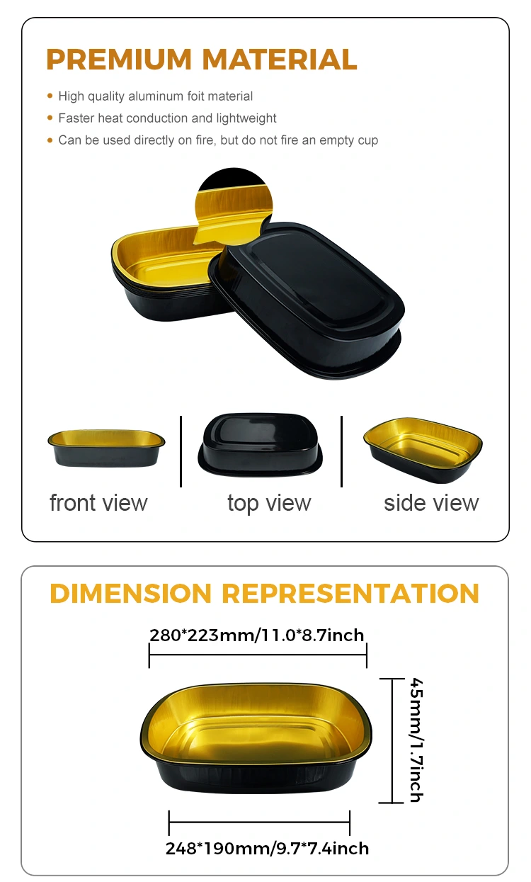 I contenitori per fogli di alluminio rettangolare in alluminio in oro nero per la ristorazione in oro nero di alluminio sono adatti a più persone o porzioni singole o scenari di ristorazione self-service, specialmente adatti alla confezione di piatti come gratin o pasta al forno. Questo prodotto è adatto anche per le scatole per il pranzo di imballaggio, la ristorazione e il takeaway, nonché la confezione selettiva di piatti preparati. Il contenitore è realizzato con un foglio di alluminio alimentare di alta qualità, che è sicuro e privo di odori, e soddisfa gli standard internazionali di contatto alimentare. Se combinato con pellicola di tenuta a calore, può ottenere una tenuta efficiente e prevenire efficacemente perdite di zuppa, rendendolo adatto per attrezzature di tenuta automatizzata. Il contenitore ha una superficie liscia e piatta per una facile etichettatura e un bell'aspetto che aiuta a migliorare l'immagine del marchio. È resistente a temperature elevate e basse, può essere utilizzato nell'intervallo di temperatura da -20 ° C a 250 ° C e supporta vari metodi di riscaldamento come refrigerazione, cottura e cottura a vapore. Il materiale in alluminio è riciclabile al 100% e soddisfa i requisiti di sviluppo sostenibile.