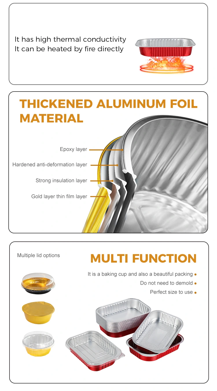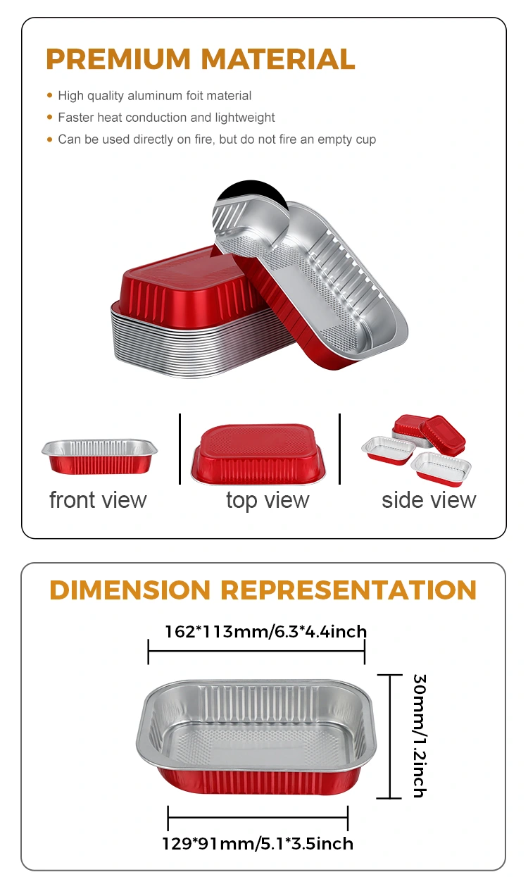 -Il materiale del contenitore da asporto rettangolare in alluminio rosso può bloccare la freschezza e la freschezza del cibo. Le sue eccellenti proprietà di conduzione del calore e di isolamento gli consentono di essere riscaldato direttamente nel forno, nel microonde e refrigerato nel frigorifero, conservando efficacemente il sapore originale del pasto e mantenendo a lungo il gusto ideale.