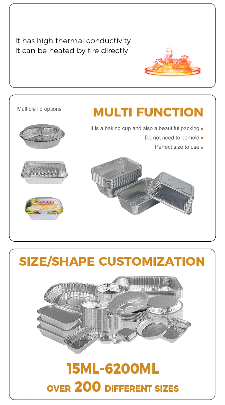 Il contenitore in foglio di alluminio argentato monouso per friggitrice ad aria rettangolare monouso del produttore di fogli di alluminio Yunchu è progettato per le esigenze di cucina, cottura al forno e ristorazione conveniente. Utilizza come materia prima un foglio di alluminio per uso alimentare ed è stampato con precisione per tenere conto della sicurezza, della praticità e della protezione dell'ambiente. Risolve completamente i problemi legati alla noiosa pulizia dopo la cottura, alla scarsa adattabilità del contenitore e all'odore degli ingredienti, rendendo ogni pasto facile, senza preoccupazioni, pulito ed efficiente. Il contenitore rettangolare monouso in foglio di alluminio argentato della friggitrice ad aria ha una certa conduttività termica, conduce il calore in modo uniforme e rapido e può adattarsi con precisione all'ambiente ad alta temperatura della friggitrice. Può resistere a temperature estreme da -20°C a 250°C. Può essere posizionato direttamente nella friggitrice per il riscaldamento dopo essere stato tolto dal frigorifero senza cambiare il contenitore. Il materiale del foglio di alluminio ispessito è molto resistente e non facile da deformare o rompere. Evita di sporcare la pentola interna della friggitrice e del forno, eliminando la necessità di noiose fasi di pulizia. Essendo un prodotto monouso, può essere gettato via dopo l'uso senza pulirlo, liberando completamente le mani. Allo stesso tempo, il materiale del foglio di alluminio può essere riciclato al 100%.