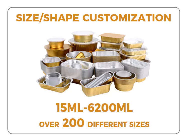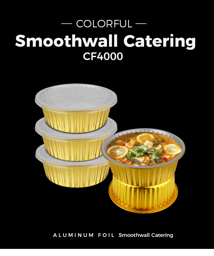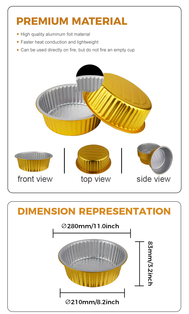 Le eccellenti prestazioni di conduzione del calore sono uno dei vantaggi principali dei contenitori monouso rotondi in foglio di alluminio dorato di grande capacità. Il foglio di alluminio conduce il calore in modo rapido e uniforme. Che sia cotto in forno, riscaldato su fiamma libera o nel forno a microonde, può garantire che il cibo venga riscaldato in modo uniforme, abbreviare i tempi di cottura e conservare il sapore originale degli ingredienti. Il design circolare è più favorevole alla circolazione del calore. Abbinato a una copertura in foglio di alluminio sigillabile, non solo può prevenire la perdita di umidità ma anche ottenere conservazione e riscaldamento integrati. Durante la consegna da asporto, può mantenere efficacemente il cibo caldo, consentendo ai consumatori di gustare cibi caldi in qualsiasi momento.