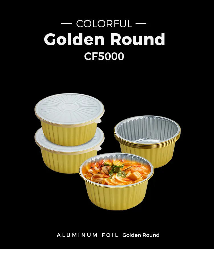 Lamina di alluminio yunchu in alluminio usa e getta contenente contenitori in alluminio rotondo in alluminio modello CF5000 L'ingrosso ha una vasta gamma di usi, può utilizzare il coperchio per sigillazione del calore in alluminio coperto per la cottura, lo stoccaggio, il trasporto e la fornitura di tutti i tipi di alimenti per la gamma di montaggio, ecc. Negozi, feste natalizie, attività di catering, negozi di catering self-service, ecc., Contenite di lamina in alluminio rotondo in alluminio rotondo monouso per un foglio di alluminio 8011-0 di alta qualità, vassoio da forno monouso con coperchio è durevole, non facilmente forato o danneggiato; Il materiale consente la distribuzione uniforme di calore, buona ritenzione di calore, nessuna appiccicosità, combustione, impermeabile e a prova di olio, non è necessario pulire, nessun carico per le macchie di olio. I bordi lisci non ti fanno male le mani, garantendo che i piatti pre-preparati siano completamente cotti; La padella è rifinita in un elegante colore in oro che migliora la presentazione e completa la cucina o l'arredamento degli eventi.