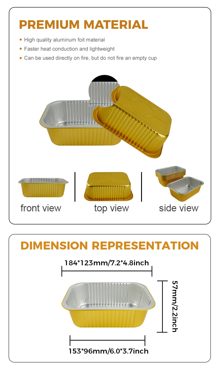 Sterlina in alluminio yunchu Sigillo monouso sigillo gratin I contenitori in alluminio, adatti a una singola porzione di riso al forno o pasta al forno e altri piatti che imballaggi, confezionamento di imballaggi per il pranzo e tack-out, i piatti pre-fatti in foglio di imballaggio, in linea con aluminazione di aluminio di aluminio di aluminio di aluminio di aluminio di aluminazione ad aluminio Con la pellicola di tenuta a calore, può ottenere una tenuta efficiente e impedire efficacemente la perdita di zuppa, che è adatta per l'attrezzatura automatica di tenuta. La superficie del contenitore è liscia e piatta, che è facile da etichettare, ed è bella e generosa, il che aiuta a migliorare l'immagine del marchio. È resistente alle temperature elevate e basse, può essere utilizzato in un intervallo di temperatura compreso tra -20 ° C a 250 ° C e supporta una varietà di metodi di riscaldamento come refrigerazione, cottura e vapore. Il materiale in alluminio è riciclabile al 100% e sostenibile.