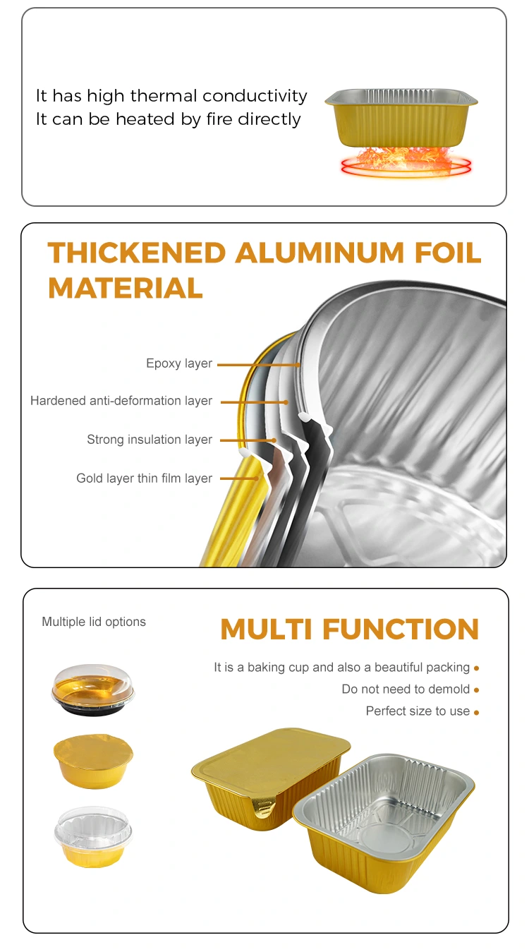 Fornitore di fogli di alluminio Yunchu I contenitori per fogli di alluminio gratinumi usa e getta sono accuratamente realizzati in materiale in alluminio alimentare di alta qualità, che può essere utilizzato con coperchio di sigillatura in alluminio, che ha eccellenti prestazioni di tenuta, resistenza ad alta temperatura e resistenza alle perdite di olio e perdite. È ampiamente utilizzato in vari scenari come imballaggi alimentari, riscaldamento, refrigerazione e consegna da asporto. La superficie è progettata con una parete leggera e l'aspetto è piatto e liscio, il che è conveniente per la sigillatura automatica del film di tenuta a calore, in modo da migliorare l'efficienza dell'imballaggio.