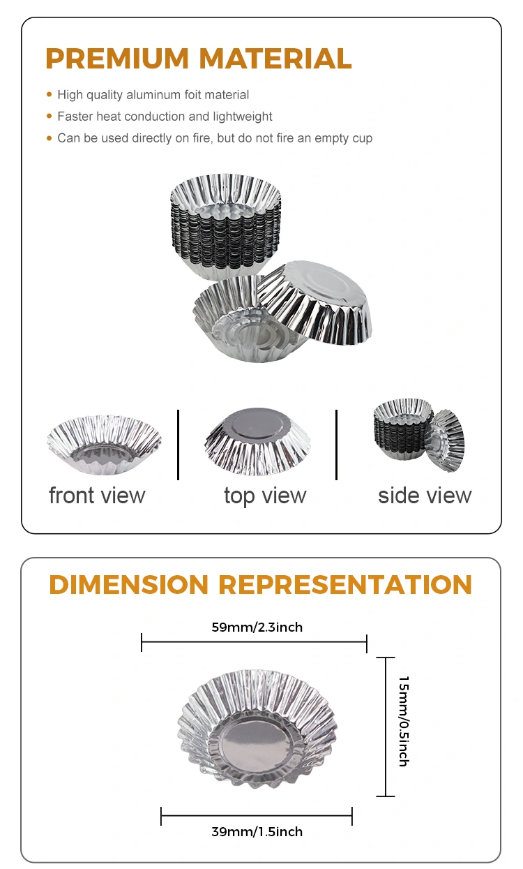 Asciugacapelli in alluminio yunchu in alluminio toast al forno argento in alluminio per alimenti per alimenti prodotti all'ingrosso progettati per crostate di uova e altri dessert. È fatto di un foglio di alluminio alimentare, che è sicuro e non tossico, e ha una buona conduttività termica, garantendo che il cibo sia riscaldato uniformemente e abbia un sapore migliore durante il processo di cottura. Questo vassoio di crostata di uova è versatile e adatto per varie occasioni come raccolti familiari, eventi aziendali, ecc. Facile da rimuovere lo stampo ad alta temperatura quando si utilizza, dopo che il prodotto finito è stato completato, facile da rimuovere il film, il fondo antiadere Scorrisci e attenersi al fondo, il cibo antiaderente è facile da cuocere, il fondo è liscio, può resistere a -20 ° C ~ 300 ° C, può essere riscaldato su una fiamma aperta e lo stampo viene riscaldato uniformemente.