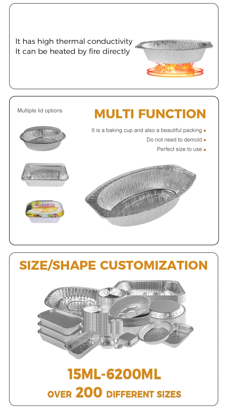 Il fornitore di lamina di alluminio Yunchu offre contenitori in alluminio in alluminio in argento al forno ovale per cucina casalinga, panetterie, catene di catene e consegna di alimenti refrigerati. Realizzato con materiale in alluminio in alluminio di grado alimentare, questo contenitore presenta una forma ovale unica che lo distingue tra le molte scatole da forno d'argento. Questo contenitore è particolarmente adatto per contenere fazzoletti caldi, frutta, pane e tutti i tipi di alimenti replici e può soddisfare le esigenze di una vasta gamma di stoviglie. A causa della sua buona conduttività termica, può dissipare uniformemente le alte temperature, garantendo che il cibo sia riscaldato uniformemente. Inoltre, ha una certa capacità di carico e resistenza alla pressione, mantenendo la stabilità anche nel caso di più pile, prevenendo la deformazione ed è ideale per l'uso durante il trasporto. Al fine di adattarsi meglio a diversi scenari e esigenze, questo contenitore può anche essere personalizzato in base alle esigenze dei clienti e fornire coperchi corrispondenti per una maggiore praticità.