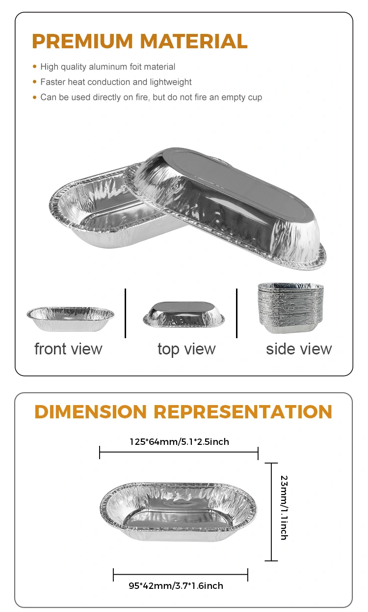 Il contenitore alimentare per lamina d'argento ovale Yunchu ha una dimensione molto modesta, con un diametro superiore di 125*64 mm (5,1*2,5 pollici), un diametro di base di 95*42 mm (3,7*1,6 pollici), un'altezza di soli 23 mm (1,1 pollici) e una capacità di 105 ml (3.7 oz). Questa dimensione non è solo facile da trasportare, ma può anche soddisfare una varietà di esigenze di utilizzo diverse.