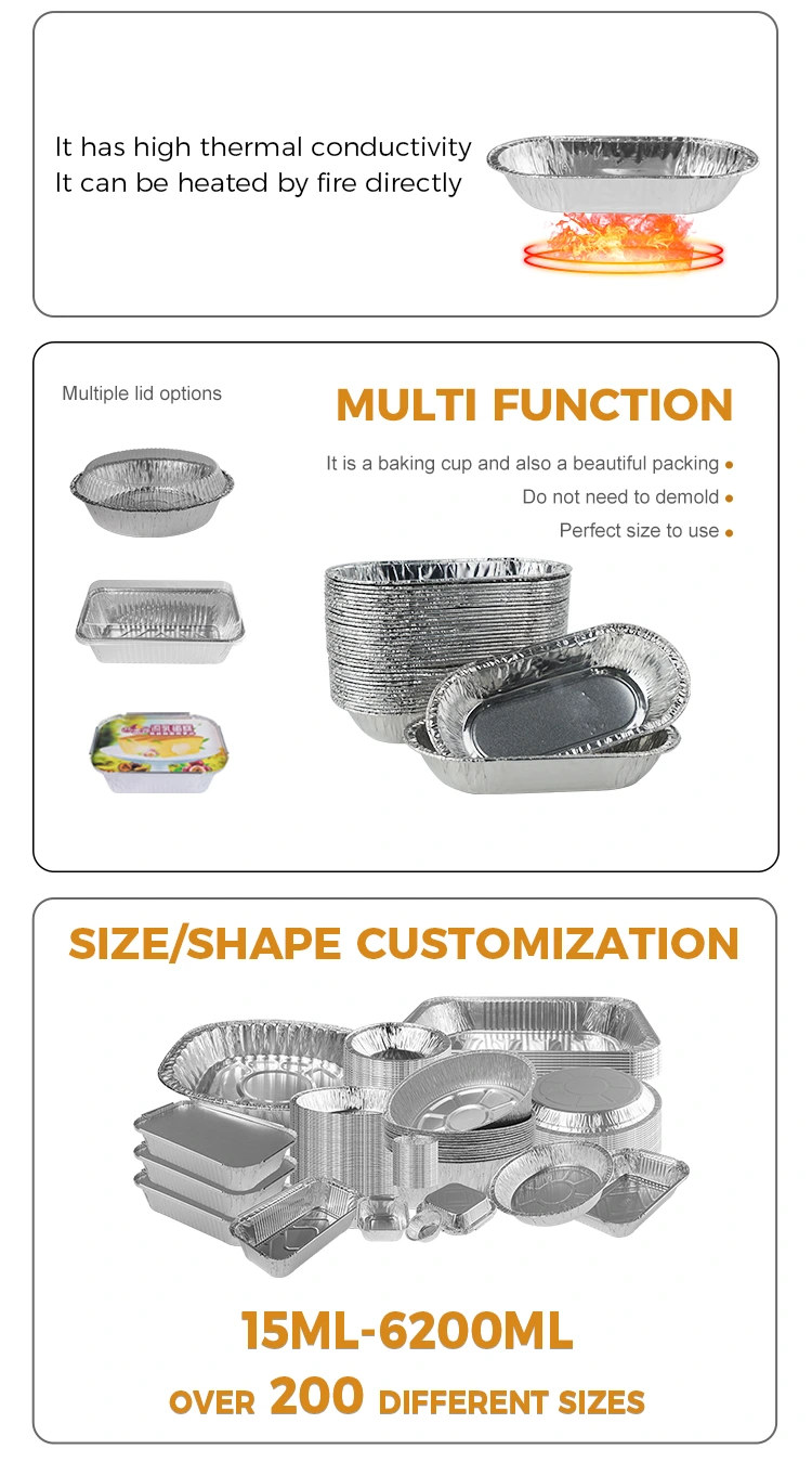 Grazie al suo design piccolo e leggero, questo contenitore alimentare in alluminio in alluminio arrosto ovale è perfetto per trasportare e conservare cibo, adatto all'uso e alla personalizzazione del negozio di alimenti nei negozi, nei fast food e altro ancora. La progettazione della trama convessa e convessa nella parte inferiore aiuta a migliorare l'attrito e distribuire il calore uniformemente ed evitare il surriscaldamento locale. Inoltre, la scatola del foglio di alluminio è stata ispessita per migliorare la resistenza alla compressione e la durata e può rimanere stabile anche durante il trasporto e non è facile da deformarsi.