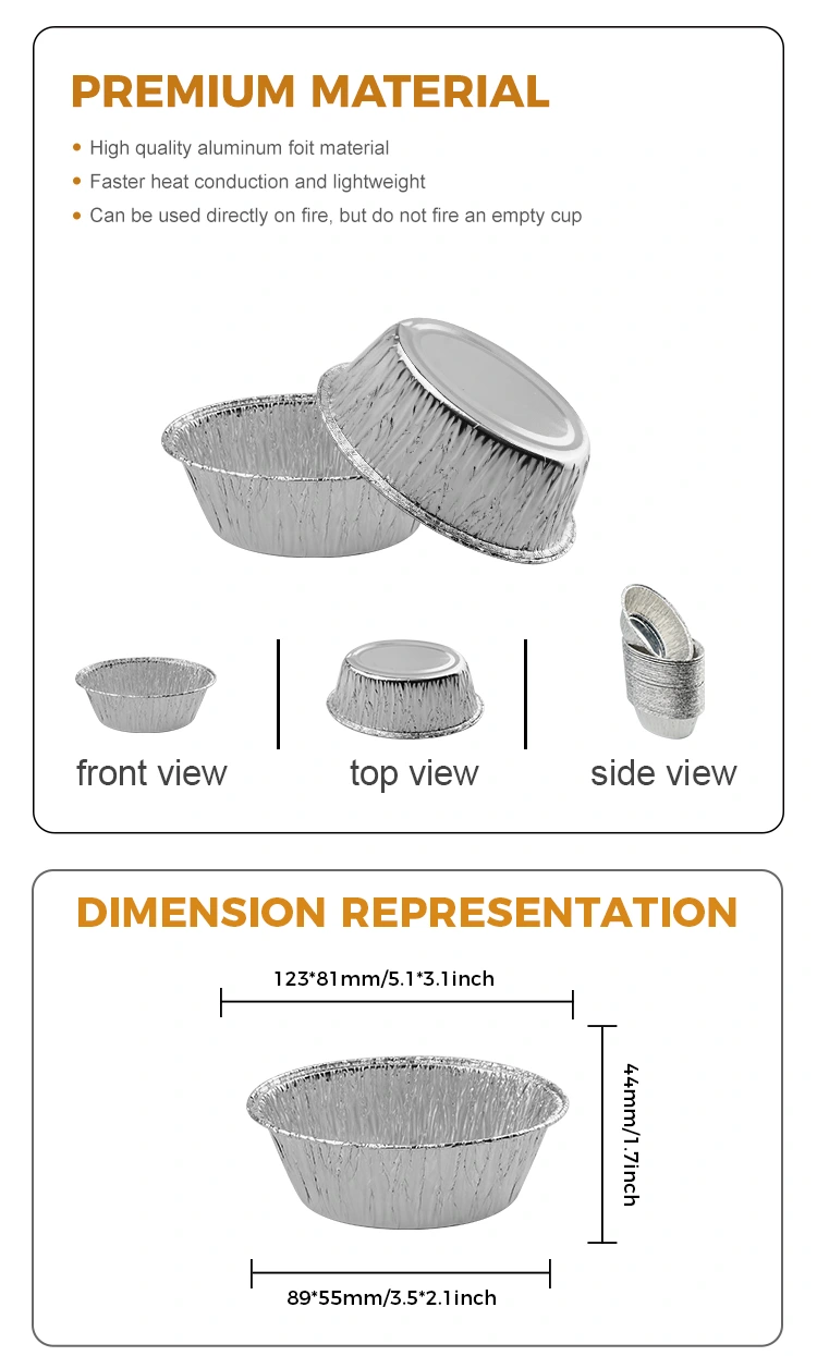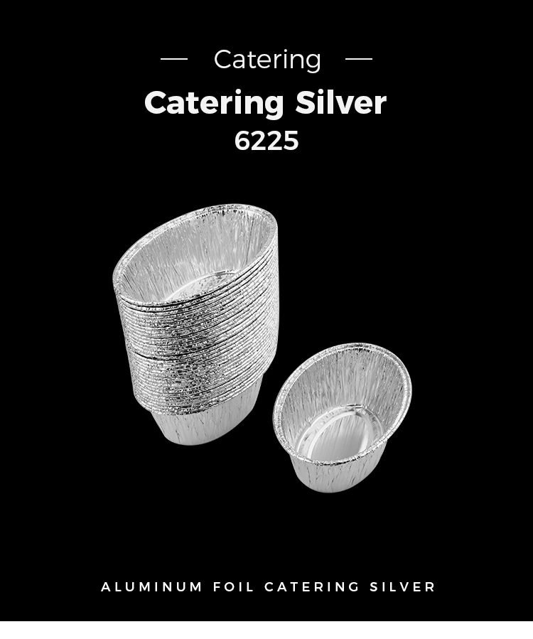 Fornitore di fogli di alluminio Yunchu Torta ovale al vapore Il contenitore per alimenti in foglio di alluminio argentato modello 6225 è un contenitore in foglio di alluminio che può essere utilizzato per uso commerciale e domestico, che può sbloccare più usi, come uova al forno, ostriche al forno, crostate di uova, torte, ecc., e può anche essere usato come salse, salse, piccoli condimenti e campioni di degustazione di prodotti da forno, utilizzando argento alimentare 8011 materiale in foglio di alluminio, stampaggio integrale, la parete è liscia come uno specchio, il che è allo stesso tempo bello e pratico, il design dell'orlo non fa male alle mani e una varietà di specifiche e dimensioni soddisfano le diverse esigenze.