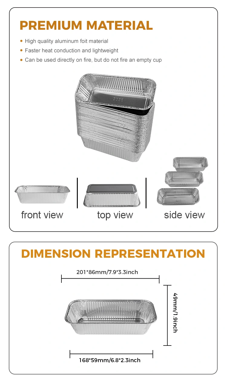 Fornitore di fogli di alluminio Yunchu Modello 2325 Friggitore rettangolare da asporto da asporto in alluminio argento contenitori in alluminio in alluminio Il materiale in alluminio è ispessito e non facile da rompere e può essere riscaldato su una fiamma aperta, questo contenitore in alluminio in alluminio non è solo bello nell'aspetto, ma anche molto pratico. Può resistere alla cottura ad alta temperatura, non facile da bruciare o deformare il fondo e il design del fondo è anche bello ed elegante, il che può effettivamente impedire al cibo. Inoltre, il suo design a faccia alto rende la combinazione di lamina in alluminio più stabile e più facile da usare. Indipendentemente dalle specifiche di dimensioni scelte, questo contenitore in alluminio si adatta perfettamente a varie dimensioni del vaso, soddisfacendo le tue diverse esigenze. Al fine di consentire a più consumatori di godere di prodotti e servizi di alta qualità, forniamo una varietà di specifiche di dimensioni tra cui scegliere e possiamo personalizzare la stampa di pattern in base alle tue esigenze per soddisfare le esigenze personalizzate. Con un singolo MOQ di soli 1000 pezzi, il processo di acquisto è semplice e veloce e le prestazioni dei costi sono estremamente elevate. Se hai domande o hai bisogno di ulteriori comprensioni sui nostri prodotti, non esitate a contattarci, saremo felici di servirti.