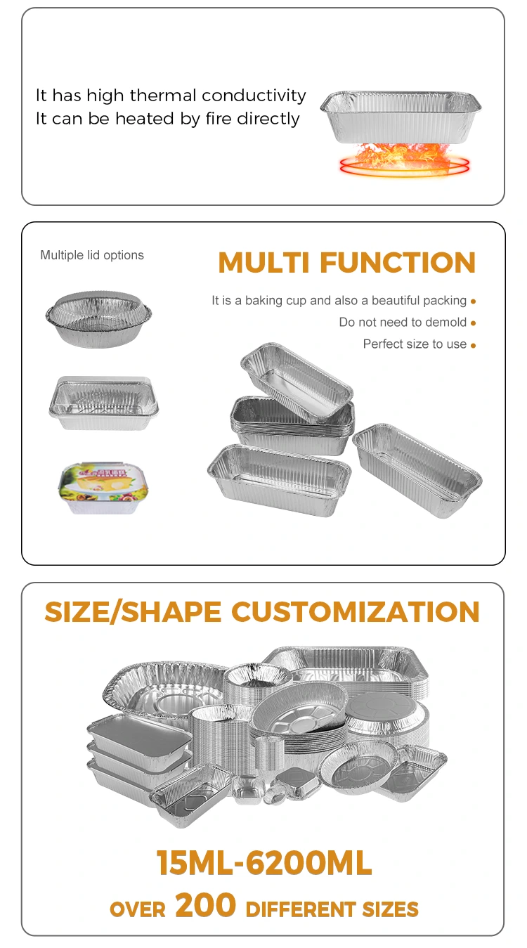 Il contenitore di lamina d'argento da asporto rettangolare friggitore rettangolare fornito dal fornitore di lamina di alluminio Yunchu è adatto per una varietà di occasioni, che si tratti di un barbecue all'aperto o di un raduno di famiglia. I commercianti possono personalizzare i motivi e stamparli in base alle loro esigenze, rendendo questi contenitori una scelta unica per l'imballaggio da asporto, che supporta il riscaldamento a fiamma aperta e il riscaldamento della lampada ad olio, conducendo il calore uniformemente, garantendo che il cibo sia riscaldato uniformemente e non si attacca alla padella. Può essere utilizzato immediatamente anche se collocato nella friggitrice e il design convesso e convesso nella parte inferiore aumenta l'attrito e impedisce lo scivolamento. Gli irrigidimenti sui lati migliorano la robustezza del prodotto, mentre il design dell'orlo garantisce una vestibilità aderente sul coperchio, chiudendo efficacemente la temperatura del cibo.