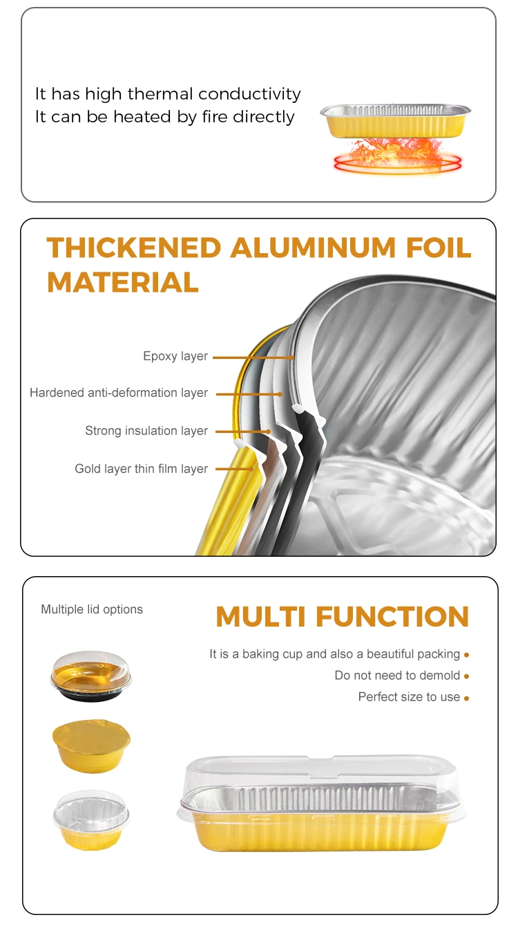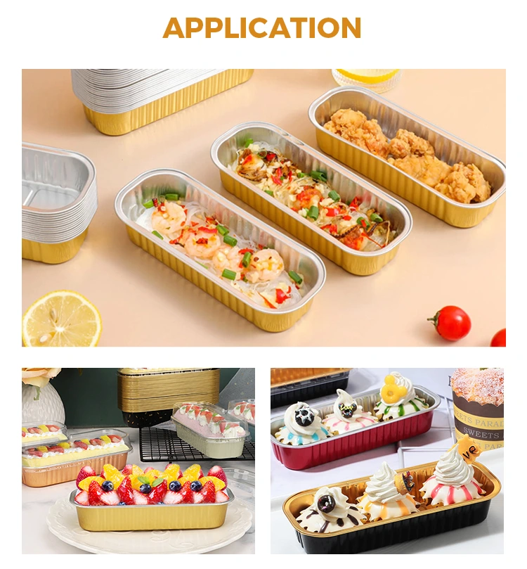 Yunchu aluminum foil supplierRectangular baking cake Smoothwall Aluminum Foil Containers is made of 8011 food-grade aluminum foil material, choose to store in the refrigerator with lid, aluminum foil lid and PET fully transparent plastic lid, cannot be used in air fryer, oven and other equipment, universal design air fryer, oven, steamer can be used with various equipment, can be reused hygienic e rispettoso dell'ambiente, il design convesso e convesso in fondo non solo aumenta la stabilità del prodotto, ma svolge anche un ruolo nell'anti-slip; Gli irrigidimenti sui lati migliorano la robustezza del prodotto, rendendolo più durevole e, inoltre, questo contenitore di lamina di alluminio a parete chiara rettangolare offre una varietà di colori tra cui scegliere, permettendoti di personalizzarlo in base alle tue preferenze.