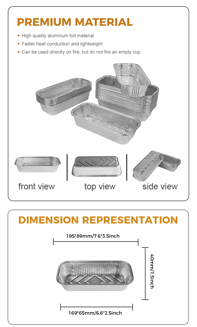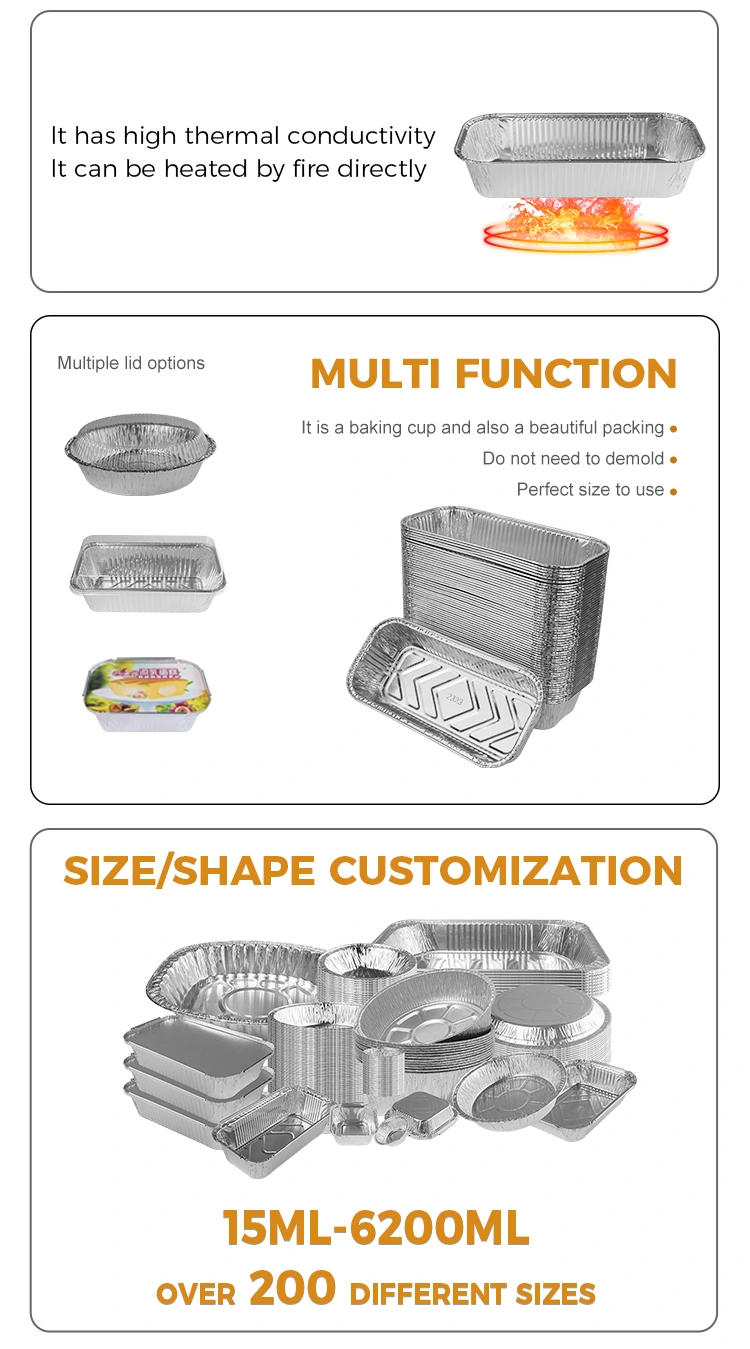 Caratteristiche: il materiale per lamina in alluminio all'ingrosso 8011 è realizzato con una buona conservazione del calore, che può mantenere la temperatura del cibo e rendere il cibo più delizioso. Inoltre, il nostro contenitore rettangolare in alluminio in alluminio in argento ha anche una funzione di conservazione del calore, che può essere abbinata al coperchio della carta in alluminio e sul coperchio in plastica, che è conveniente per personalizzare il tuo logo, approfondire ulteriormente l'impressione dei clienti e migliorare l'immagine del marchio.