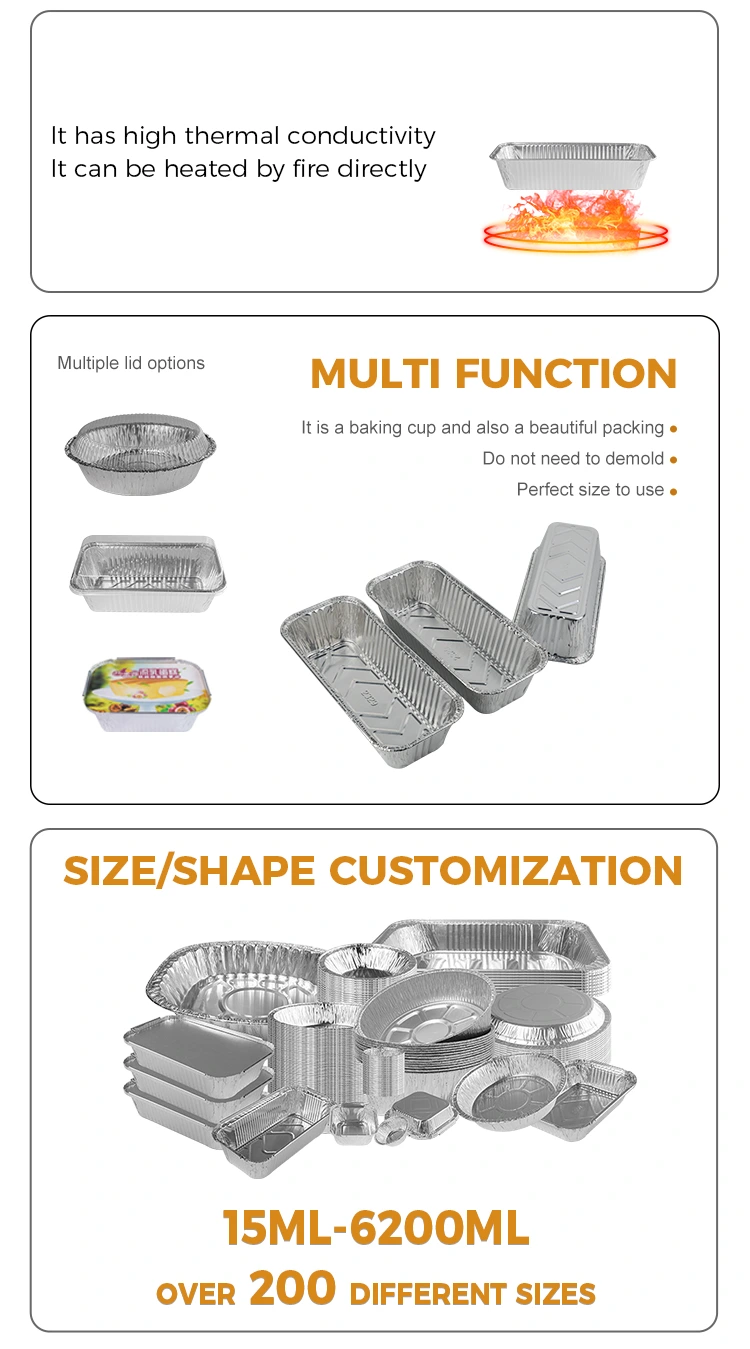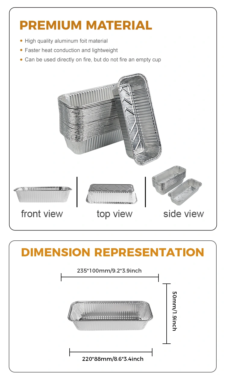 La teglia rettangolare in tela da tela da tela di pane in argento in alluminio contenitori forniti dal fornitore di lamina di alluminio Yunchu è disponibile in una varietà di dimensioni e specifiche, adatti a tutti i tipi di attrezzatura in pentola. Che si tratti di una griglia di grande o di un piccolo forno da casa, può gestirlo con facilità. È disponibile in una varietà di dimensioni e può soddisfare le esigenze di vari barbecue a fiamma aperti, che si tratti di un barbecue all'aperto o di un uso temporaneo come piatto, non ci saranno problemi.