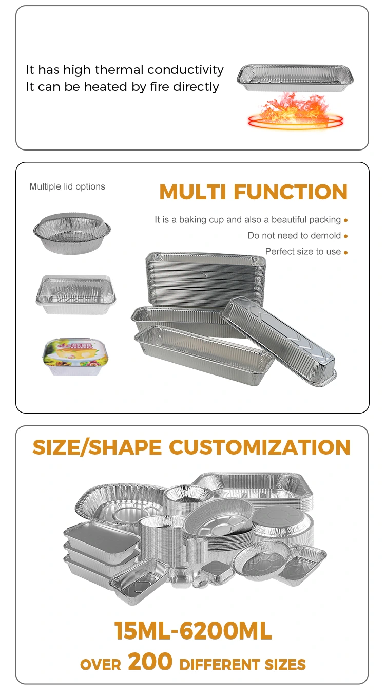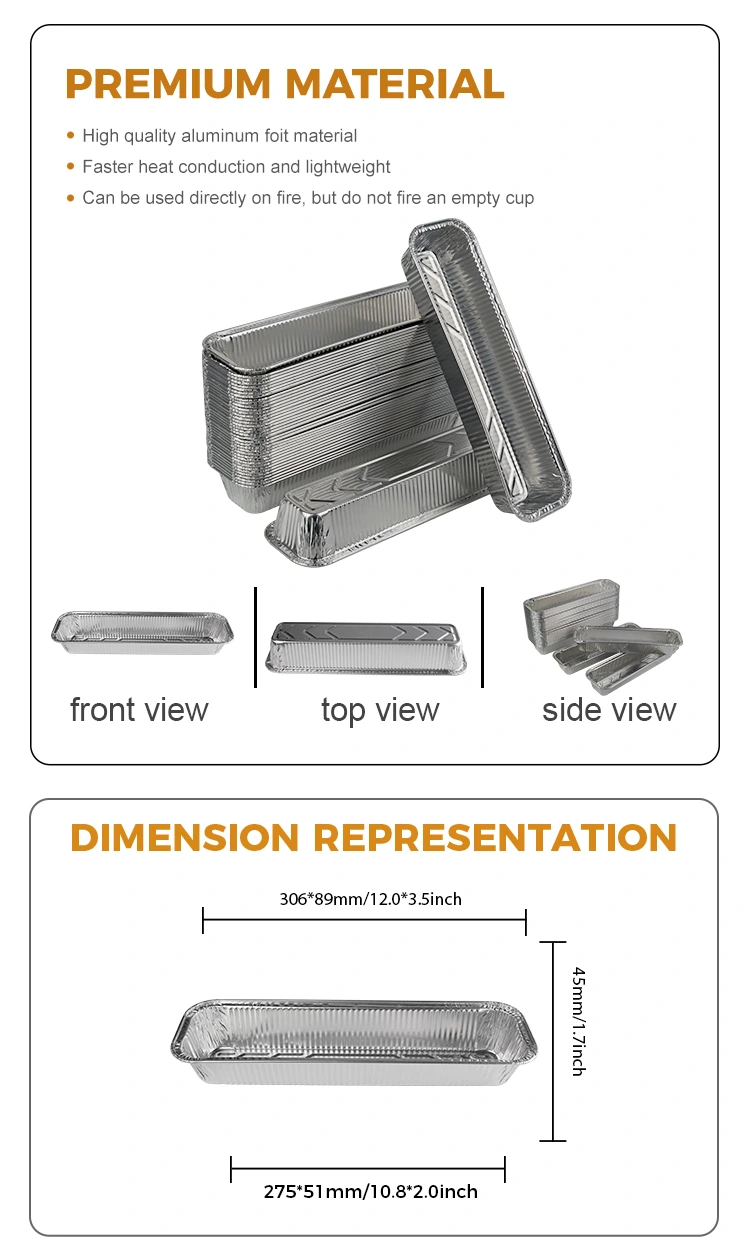 I contenitori in alluminio in alluminio in alluminio in alluminio in alluminio rettangolare forniti dal fornitore di lamina di alluminio Yunchu sono realizzati con materiali per alimenti ed è adatto per una varietà di scenari di applicazione. Questo prodotto è particolarmente adatto a scopi di grigliate e cottura, come fare lunghe pagnotte di pane o cottura. Che si tratti di grigliare a carbone o come scatola di consegna da asporto, è perfetto per l'uso.