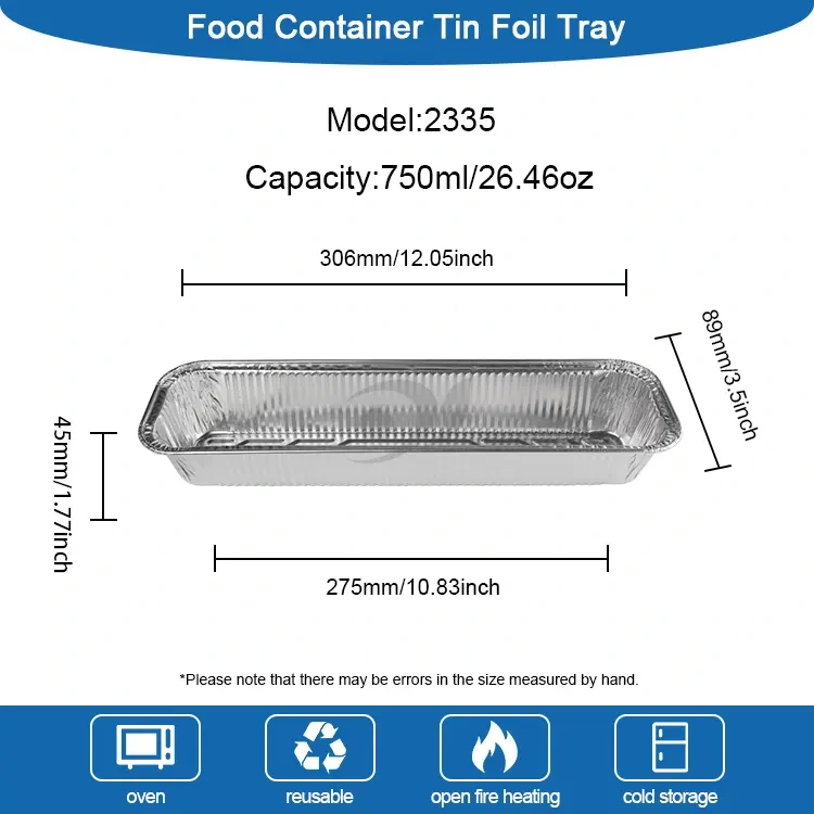 Questo vassoio rettangolare che cuociono i contenitori in alluminio in alluminio argento subisce rigorosi test di qualità per garantire che non vengano rilasciate sostanze dannose durante il riscaldamento a fiamma aperta e gli utenti non devono preoccuparsi dei problemi di sicurezza. Inoltre, il suo design ecologico e duraturo non solo garantisce il trasporto sicuro di prodotti, ma mantiene anche il miglior aspetto. Il design concavo e convesso nella parte inferiore migliora le proprietà anti-slip del prodotto, mentre gli irrigidimenti aggiunti sui lati aumentano la durezza del prodotto. Il design dell'orlo viene ispessito e approfondito, con una buona resistenza ad alta temperatura e conducibilità termica, che può ottenere un riscaldamento uniforme e nessun odore peculiare, rendendolo molto adatto per l'uso in più scenari come grigliata a carbone, pane lungo e consegna di asporto.