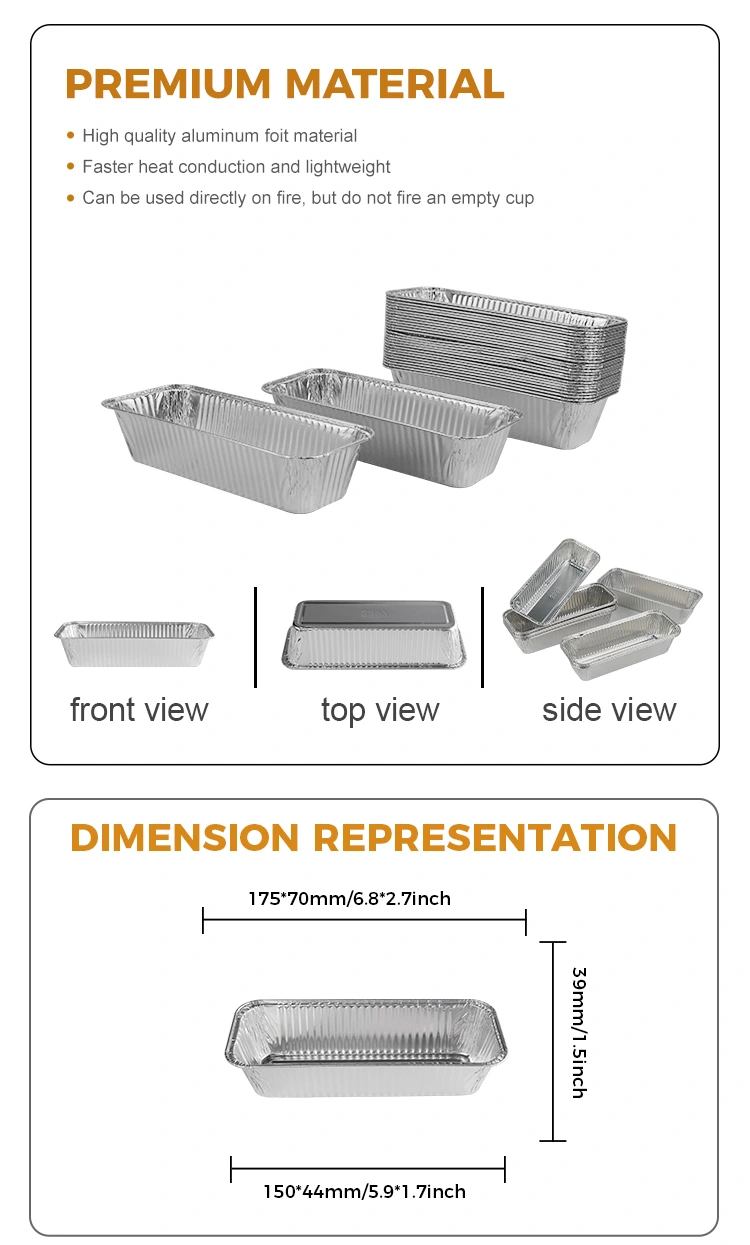 I contenitori in alluminio in alluminio in alluminio argento rettangolare forniti dal fornitore di lamina di alluminio Yunchu sono realizzati con materiali alimentari ed è adatto per una varietà di scenari di applicazione. Questo prodotto è particolarmente adatto a scopi di grigliate e cottura, come fare lunghe pagnotte di pane o cottura. Che si tratti di grigliare a carbone o come scatola di consegna da asporto, è perfetto per l'uso.