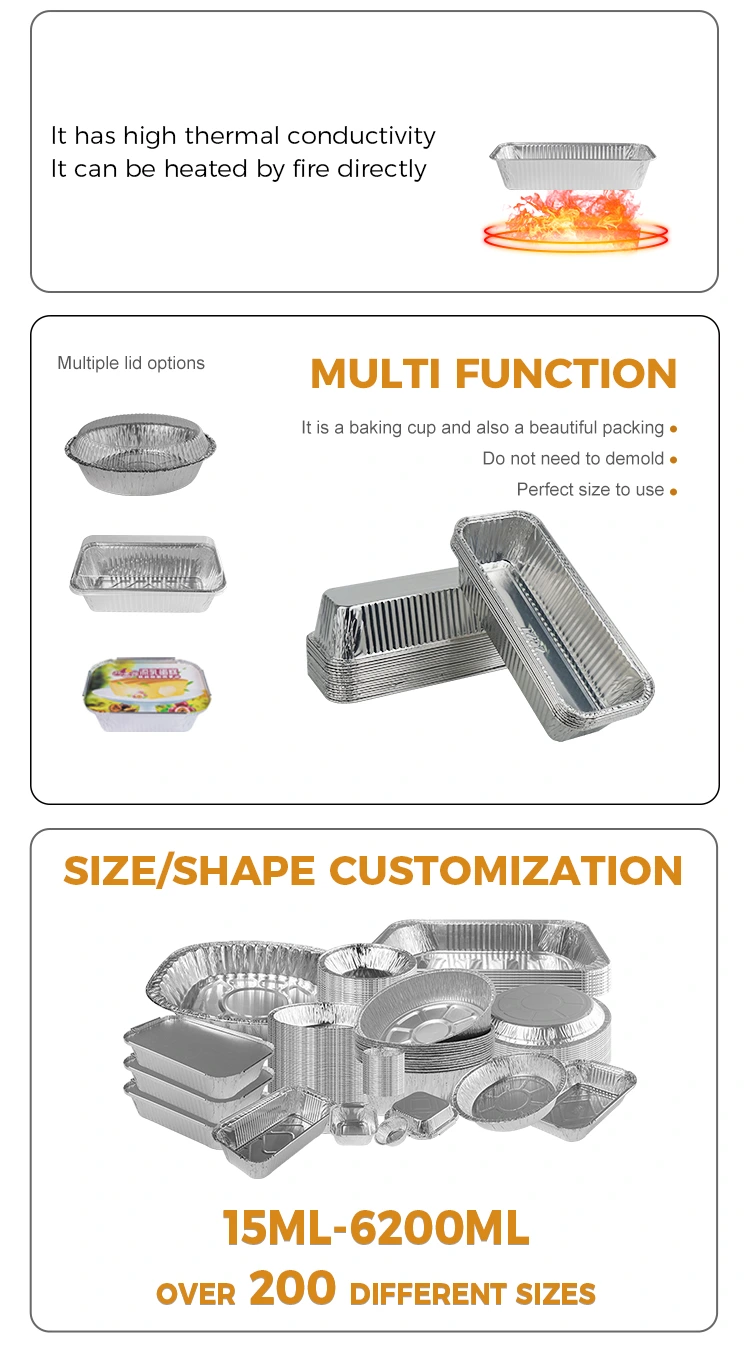Caratteristiche: I contenitori in alluminio in alluminio argento rettangolare sono sani e rispettosi dell'ambiente, utilizzando materiali alimentari, sicuri e non tossici, utilizzando materiali rinnovabili e rispettosi dell'ambiente, concentrandosi sulla sicurezza alimentare e perseguendo la qualità generale del prodotto.