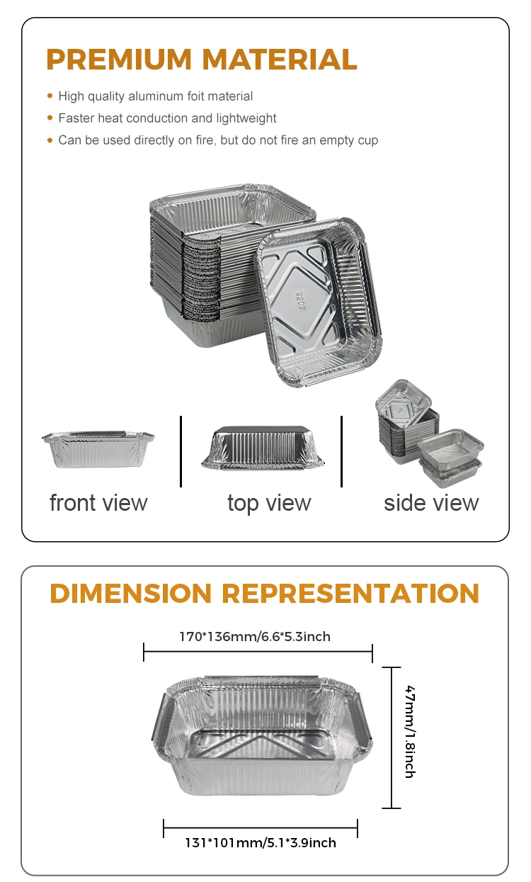 Il gratin rettangolare del modello 2056 Made in China è confezionato contenitori in alluminio in alluminio è una dimensione molto modesta, con un diametro superiore di 170*136 mm (6,9*5,3 pollici), un diametro di base di 131*101 mm (5,1*3,9 pollici), un'altezza di soli 47 mm (1,8 pollici) e una capacità di 620 ml (220 mm). Questa dimensione non è solo facile da trasportare, ma soddisfa anche una varietà di esigenze di utilizzo diverse.