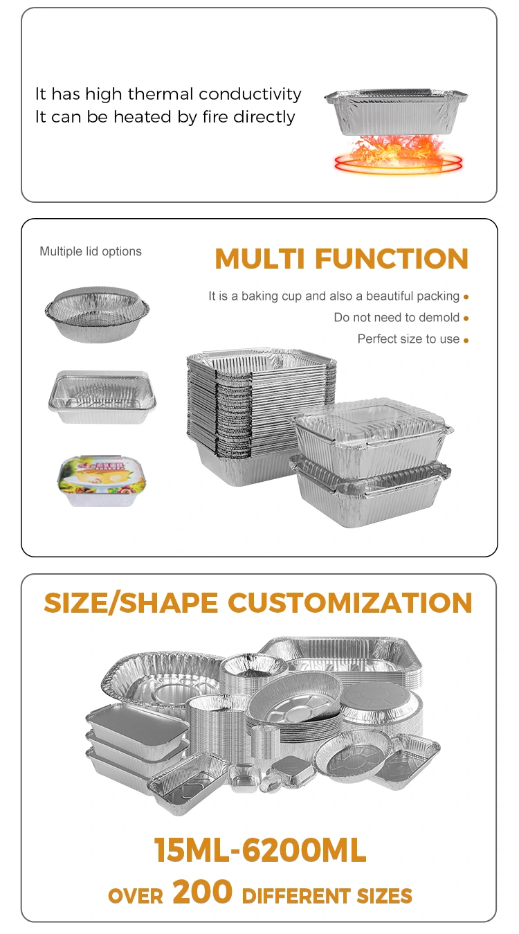 Il gratin rettangolare è confezionato contenitori in alluminio in alluminio fornito dal fornitore di lamina di alluminio Yunchu è realizzato in materiale argento di alta qualità di alta qualità. Questo contenitore è adatto per una varietà di metodi di cottura come friggitrici, barbecue, cottura e piatti pre-fatti e può riscaldare rapidamente il cibo per la vita quotidiana. È molto flessibile, il materiale è forte e resistente e non è facile deformare o rompere. Grazie al suo design ispessito, questo contenitore in alluminio può resistere al riscaldamento a fiamma aperta, garantendo la sicurezza dei consumatori e ha una buona temperatura e resistenza all'umidità, rendendolo adatto per un trasporto sicuro.