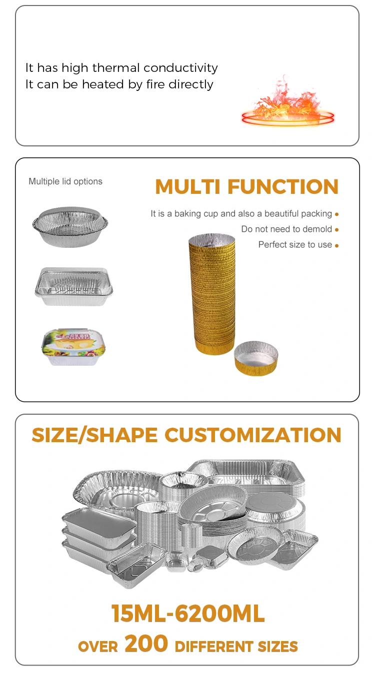 Il contenitore alimentare alimentare in alluminio in alluminio in alluminio in alluminio arrotondata per forno in alluminio in alluminio in alluminio in alluminio è molto adatto a piccoli imballaggi e applicazioni di cottura, con un design unico e una forma a forma di cuore che lo rende adatto a molteplici scopi. Inoltre, il piccolo contenitore in alluminio in alluminio argento a forma di cuore presenta un design a pieghe sulla superficie, impedendo effettivamente gli alimenti come piccoli snack e cioccolatini di scivolare, migliorando la resistenza allo slittamento. Il prodotto è disponibile in una varietà di colori per la personalizzazione.