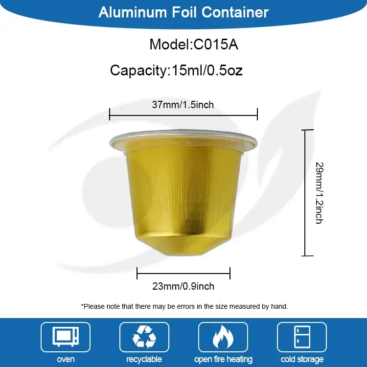 Fornitore di fogli di alluminio Yunchu Capsula di caffè vuota in silicone C015A Nelle dimensioni seguenti: diametro superiore 37 mm (circa 1,4 pollici), diametro di base 23 mm (circa 0,9 pollici), altezza 29 mm (circa 1,1 pollici). Questa capsula contiene 15 ml (circa 0,5 once) di caffè macinato, liquido per caffè. Adatto a tutte le macchine Nespresso, liquido espresso confezionato e può anche essere esteso con risciacquo dell'azoto. Inoltre, il logo e il colore possono anche essere personalizzati e il motivo può essere stampato sul coperchio del foglio di alluminio e il logo può anche essere timbrato sul fondo della capsula del caffè.
