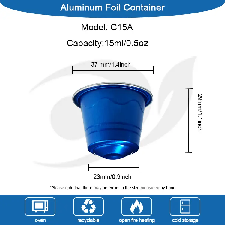 I fornitori di fogli di alluminio Yunchu offrono una capsula di caffè vuota con sela di silicone conico C15A adatto per la maggior parte delle macchine per capsula del caffè, che possono essere utilizzate per impacchettare il liquido espresso e persino prolungare la durata di conservazione mediante lavaggio dell'azoto. Inoltre, il logo e i colori possono essere personalizzati e i motivi possono essere stampati sul sigillo del foglio di alluminio e il timbro del logo può anche essere eseguito sul fondo della capsula del caffè. Le dimensioni della capsula sono le seguenti: diametro superiore 37 mm (circa 1,4 pollici), diametro di base 23 mm (circa 0,9 pollici), altezza 29 mm (circa 1,1 pollici).
